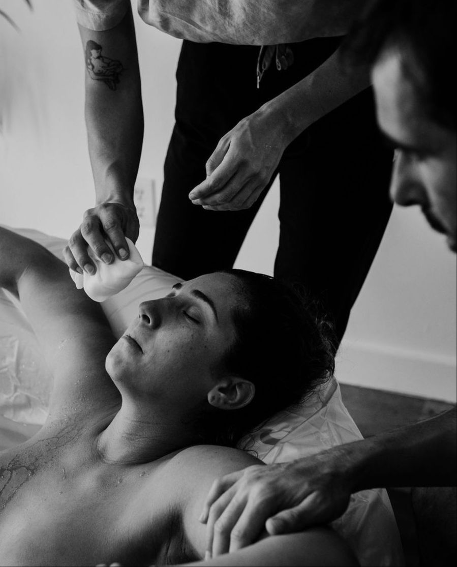 Around her stands her team: her partner, one with her in this moment; the midwife, focused on the baby; a doula, wiping the sweat that glistens on her face.