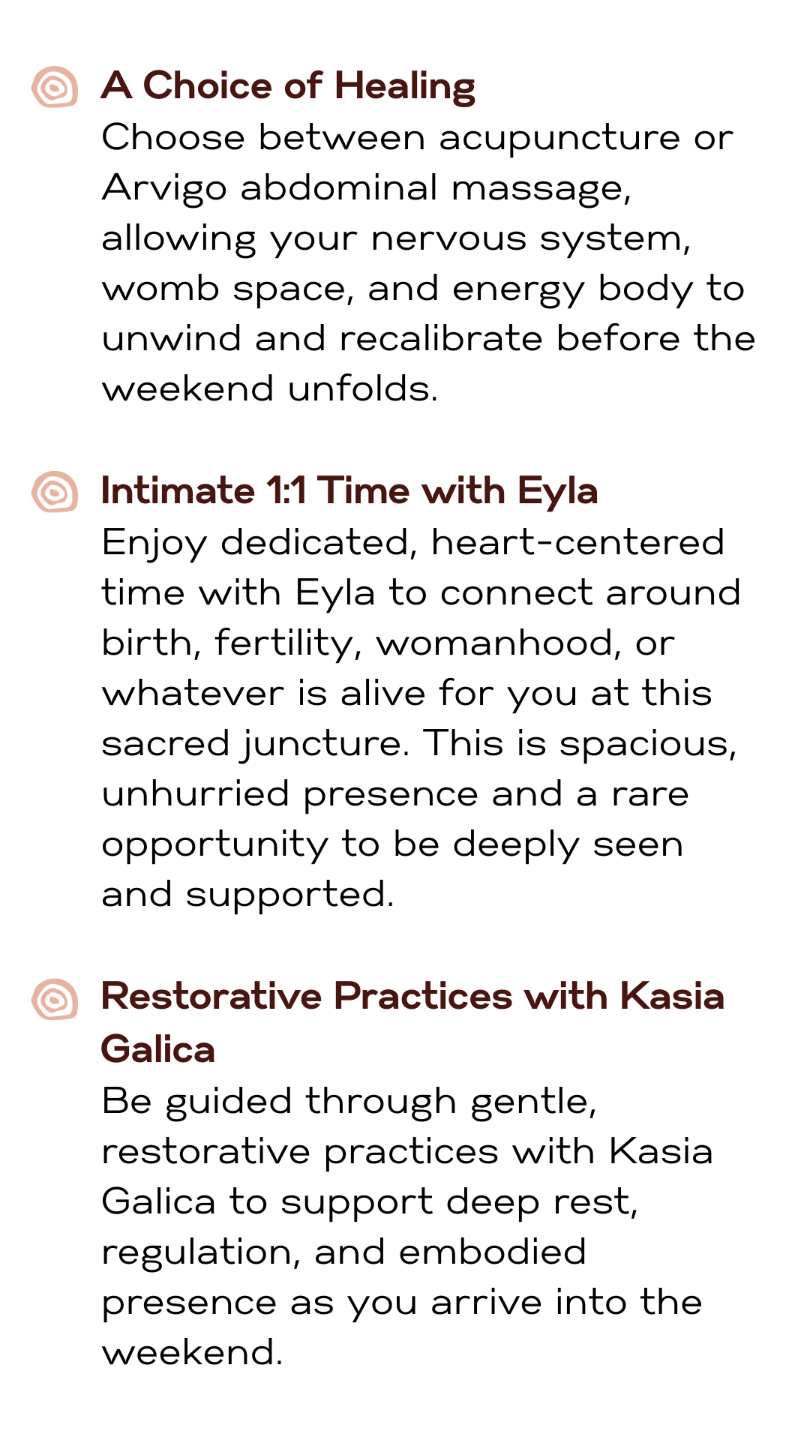 This VIP experience is an intentional exhale before the gathering begins. A soft landing into your body, your heart, and the sisterhood.